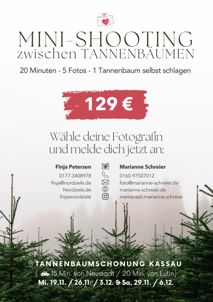 Unser Weihnachts-Mini-Shooting findet in einer Tannenschonung in Kassau statt. Das sind nur 15 Minuten mit dem Auto von Neustadt in Holstein und 20 Minuten von Eutin.